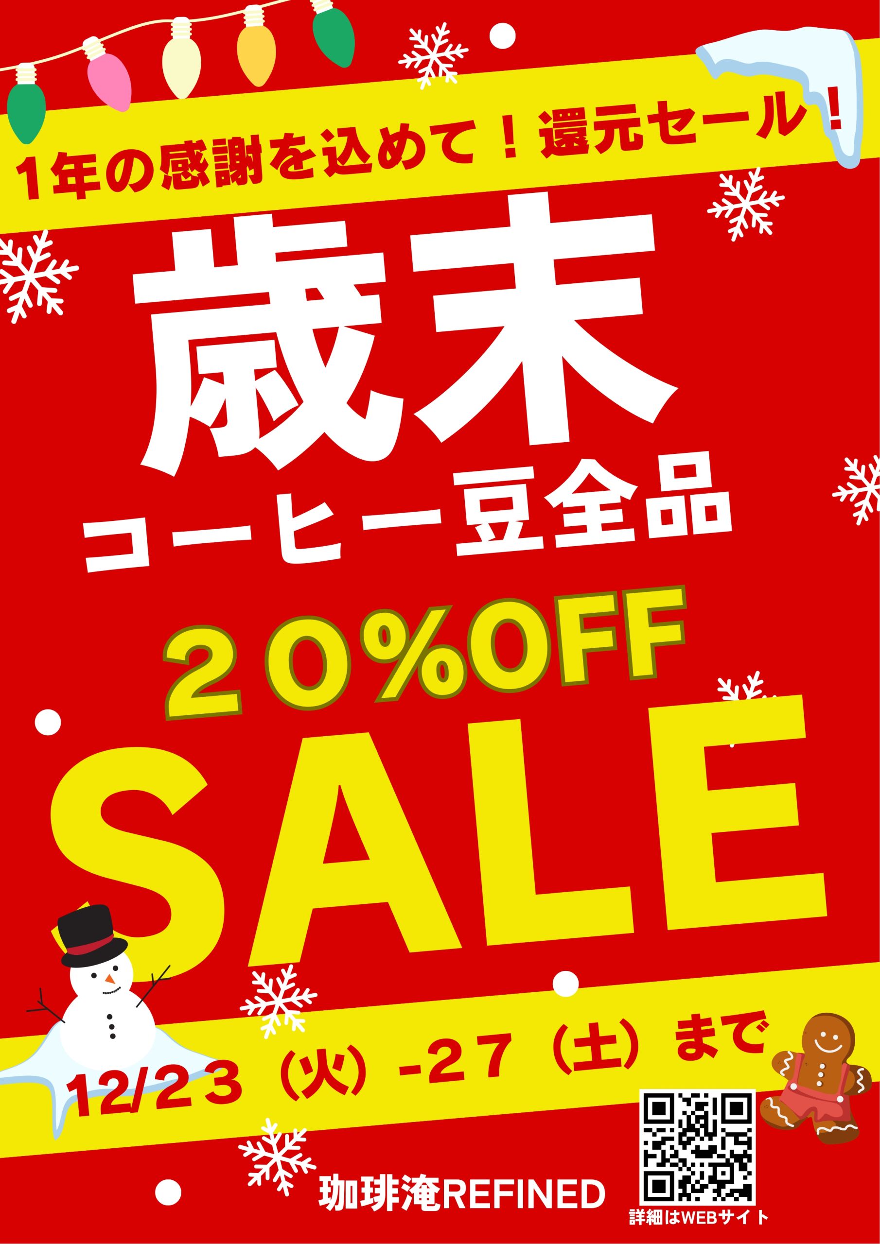 今年一年のご愛顧に感謝を込めて、歳末還元セールを開催します!期間は 12月23日(火)~27日(土) の5日間。 コーヒー豆全品が20%OFF!お気に入りの豆をお得にまとめ買いするチャンスです。この機会に、ちょっと贅沢なブレンドや新しい味にも挑戦してみませんか? ☕ 開催店舗:珈琲淹 REFINED📅 期間:12/23~12/27✅ 詳細は [公式サイト] でチェック! 寒い冬に、香り豊かなコーヒーでほっと一息。ぜひお立ち寄りください!